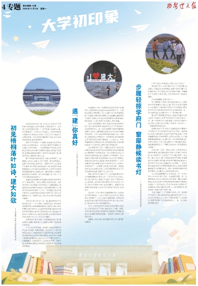 这些平凡的小事,似一针一线,编织成我对大学最初的记忆——中午操场上奔跑的身影,学府城中老教授粉笔与黑板摩擦的轻响,傍晚时分新同学们的攀谈,图书馆中全力以赴的学长学姐,食堂里打饭的叔叔阿姨和宿舍中认真负责的宿管,他们或许并没有什么特别之处,但他们的出现,对我来说却弥足珍贵,构成了我心中大学应有的模样。